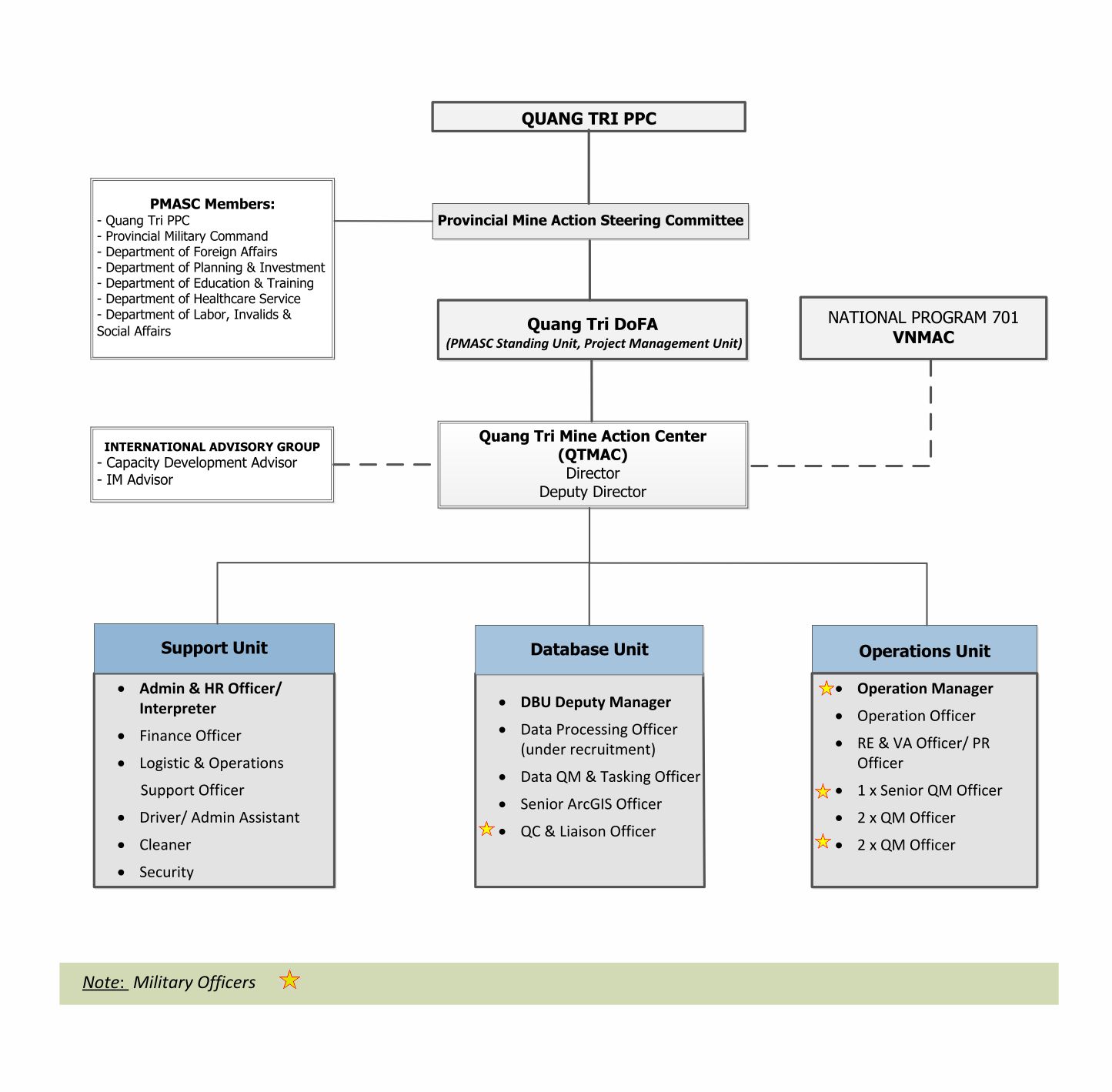 Managing The Provincial Information Management System for Mine Action of Quang Tri; effectively implementing mine action management including planning, quality management, prioritization, and coordination of post-war mine action activities in Quang Tri province.