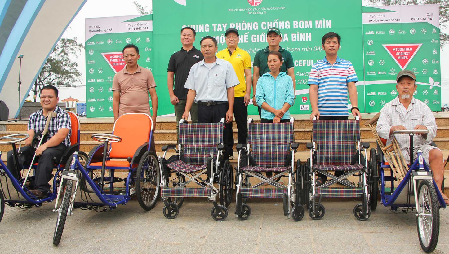 Representative of Project RENEW presents wheelchairs to landmine victims in Gio Linh district.